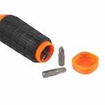 A empunhadura também conta com um espaço interno para armazenagem dos bits caso o usuário não queira utilizar a borracha organizadora que fica próxima à haste metálica.