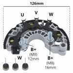 Nota: os parafusos B+ deste retificador têm 16mm e 12mm de comprimento, medidos da ponta do parafuso até a superfície do retificador. O retificador tem 6 diodos avalanche de 50A.