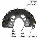 Nota: os parafusos B+ deste retificador têm 18mm e 8mm de comprimento, medidos da ponta do parafuso até a superfície do retificador. O retificador suporta até 150A, tem 6 diodos de 50A cada e ligação do estator em estrela.