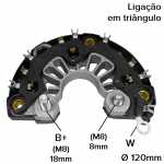 Nota: os parafusos B+ deste retificador têm 18mm e 8mm de comprimento, medidos da ponta do parafuso até a superfície do retificador. O retificador suporta até 180A, tem 6 diodos de 60A cada e ligação do estator em triângulo.