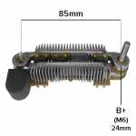 Nota: o parafuso B+ deste retificador tem 24mm de comprimento, medidos da ponta do parafuso até a superfície do retificador. O retificador suporta até 105A, tem 6 diodos de 35A cada, possui triodo, possui capacitor e não tem parte plástica.